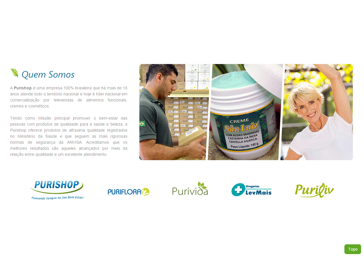 A Purishop é uma empresa 100% brasileira que há mais de 18 anos atende todo o território nacional e hoje é líder nacional em comercialização por televendas de alimentos funcionais, cremes e cosméticos.
